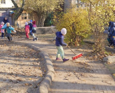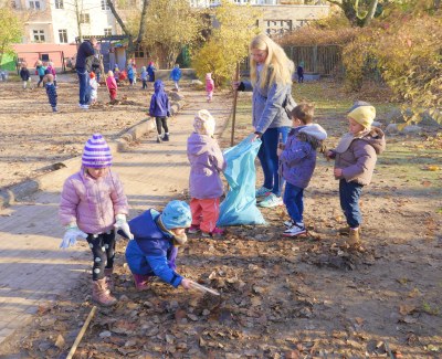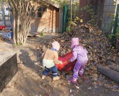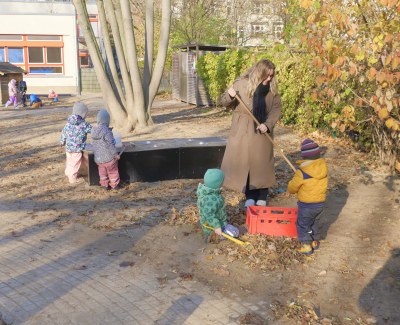 Am Standort in der Scherenbergstraße packten alle mit an: Die pädagogischen Fachkräfte und Kinder der Krippen Regentropfenhaus und Wolkenzwerge sowie der Kindergärten Sonnenstrahlenhaus und Wirbelwind sammelten Laub, räumten die Wege frei und halfen dabei, den Garten winterfest zu machen.
