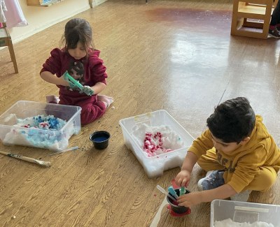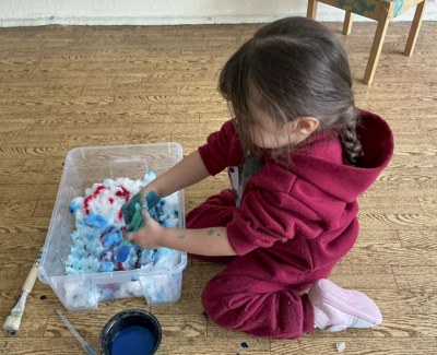 Mit Pipetten tropften die Krippenkinder vorsichtig Farbe auf den Schnee und beobachteten aufmerksam, wie sich die Farben ausbreiten, vermischen und verändern. Dabei lernten sie ganz nebenbei einfache physikalische Zusammenhänge kennen.